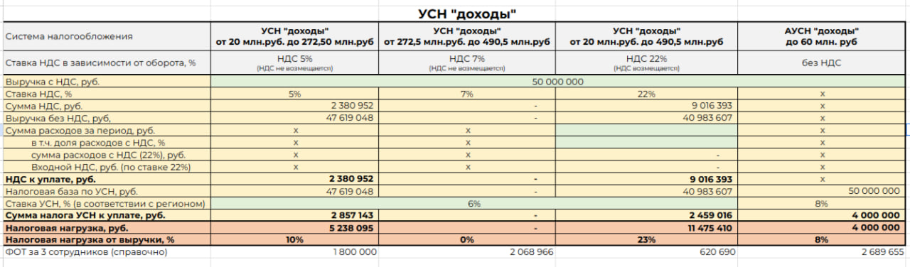 И сравним несколько режимов: УСН «Доходы» + НДС 5%, УСН «Доходы» + НДС 22%, АУСН «Доходы».